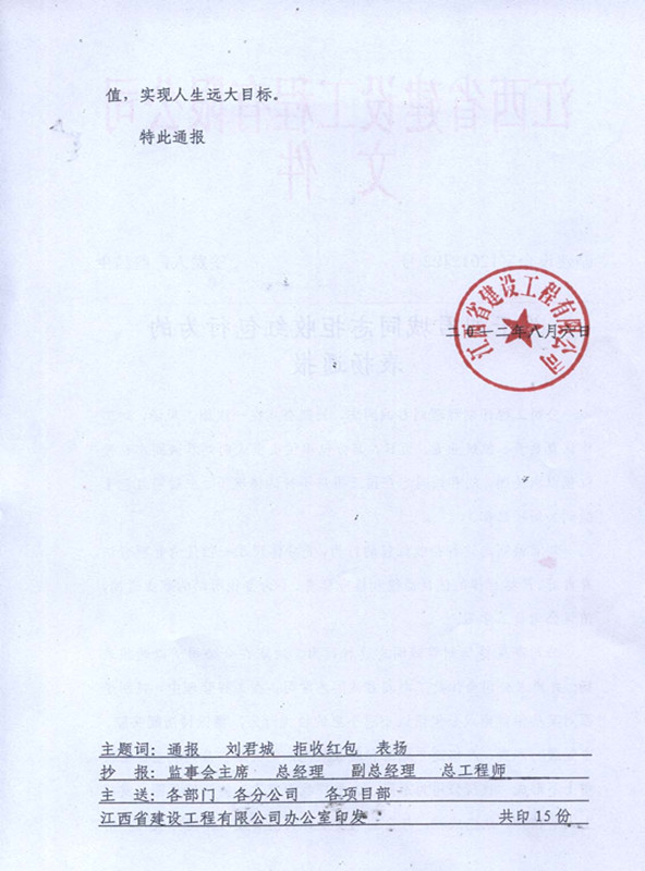 關(guān)于劉君誠同志拒收紅包的表揚通報